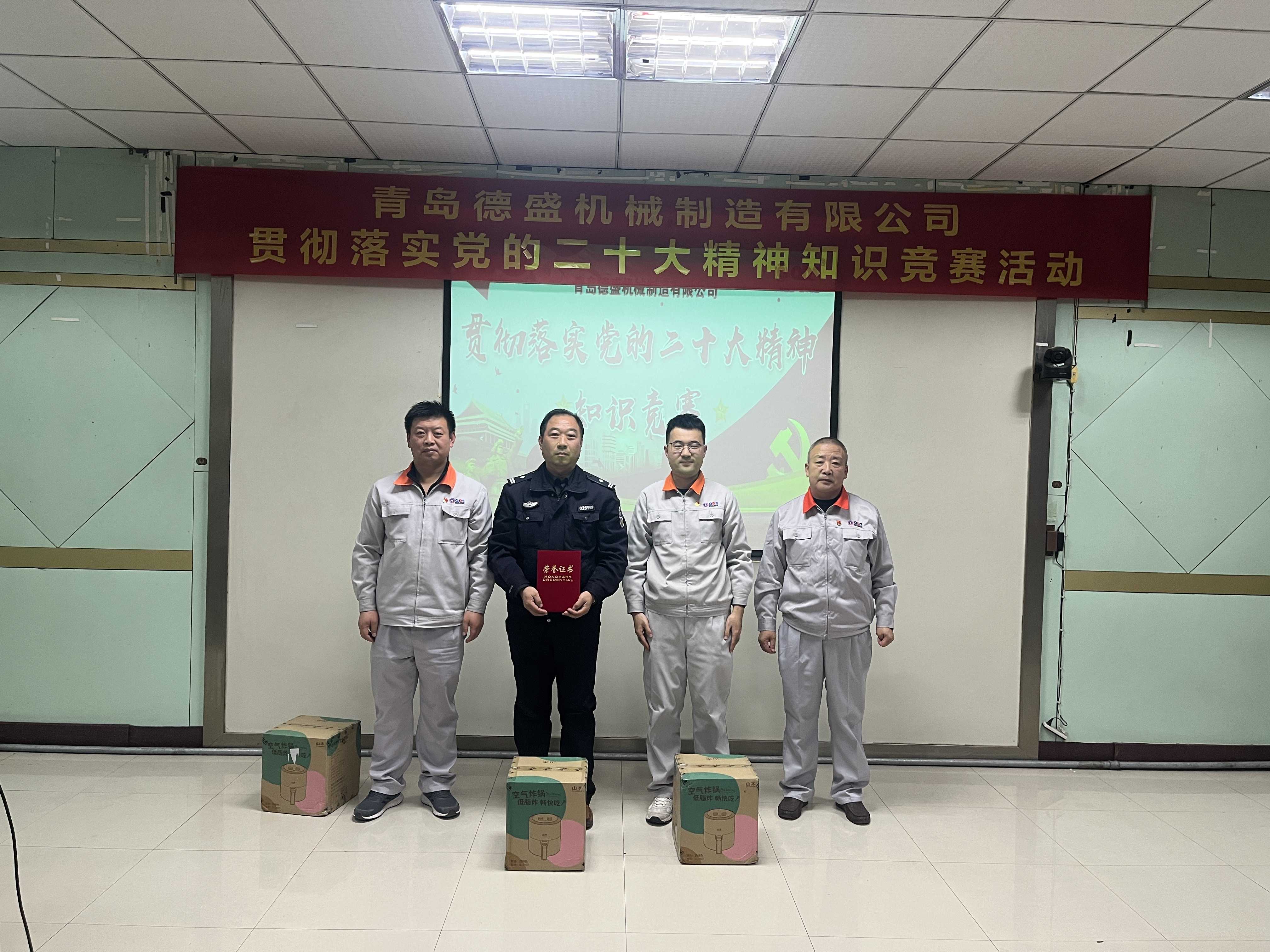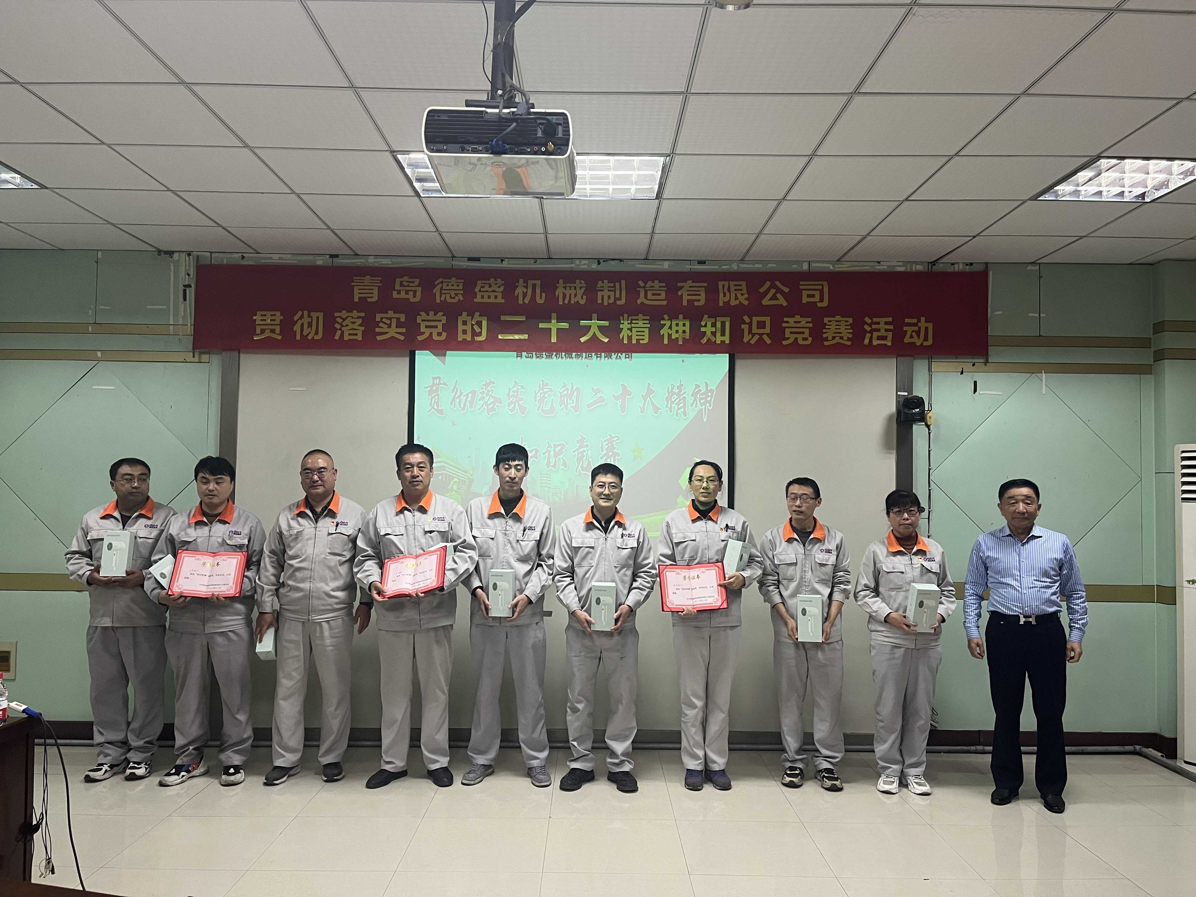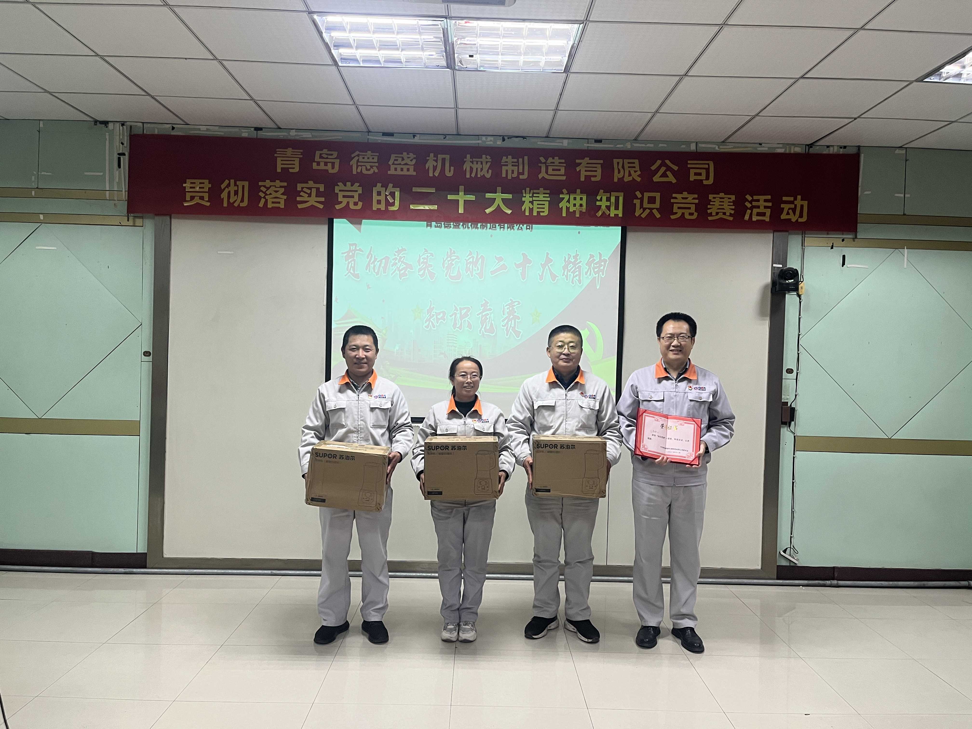 為熱烈慶祝黨的二十大勝利召開(kāi),深入貫徹落實(shí)黨的二十大精神,進(jìn)一步推進(jìn)公司黨員的思想、組織、作風(fēng)建設(shè),不斷提高理論學(xué)習(xí)水平,踔厲奮發(fā)、勇毅前行。11月18日下午,中共青島德盛機(jī)械制造有限公司黨委組織開(kāi)展了“貫徹落實(shí)黨的二十大精神”知識(shí)競(jìng)賽活動(dòng)。公司董事長(zhǎng)孫佩璋,黨委書(shū)記、營(yíng)銷(xiāo)和經(jīng)濟(jì)運(yùn)行總監(jiān)羅賽,黨委副書(shū)記、黨政管理總監(jiān)李建平,黨委委員、董事長(zhǎng)辦公室主任、黨政辦公室主任李超,黨委委員、總經(jīng)理助理、生產(chǎn)管理部經(jīng)理張錫軍,黨委委員、總經(jīng)理助理、技術(shù)研發(fā)中心主任王濤遠(yuǎn)出席本次活動(dòng)。